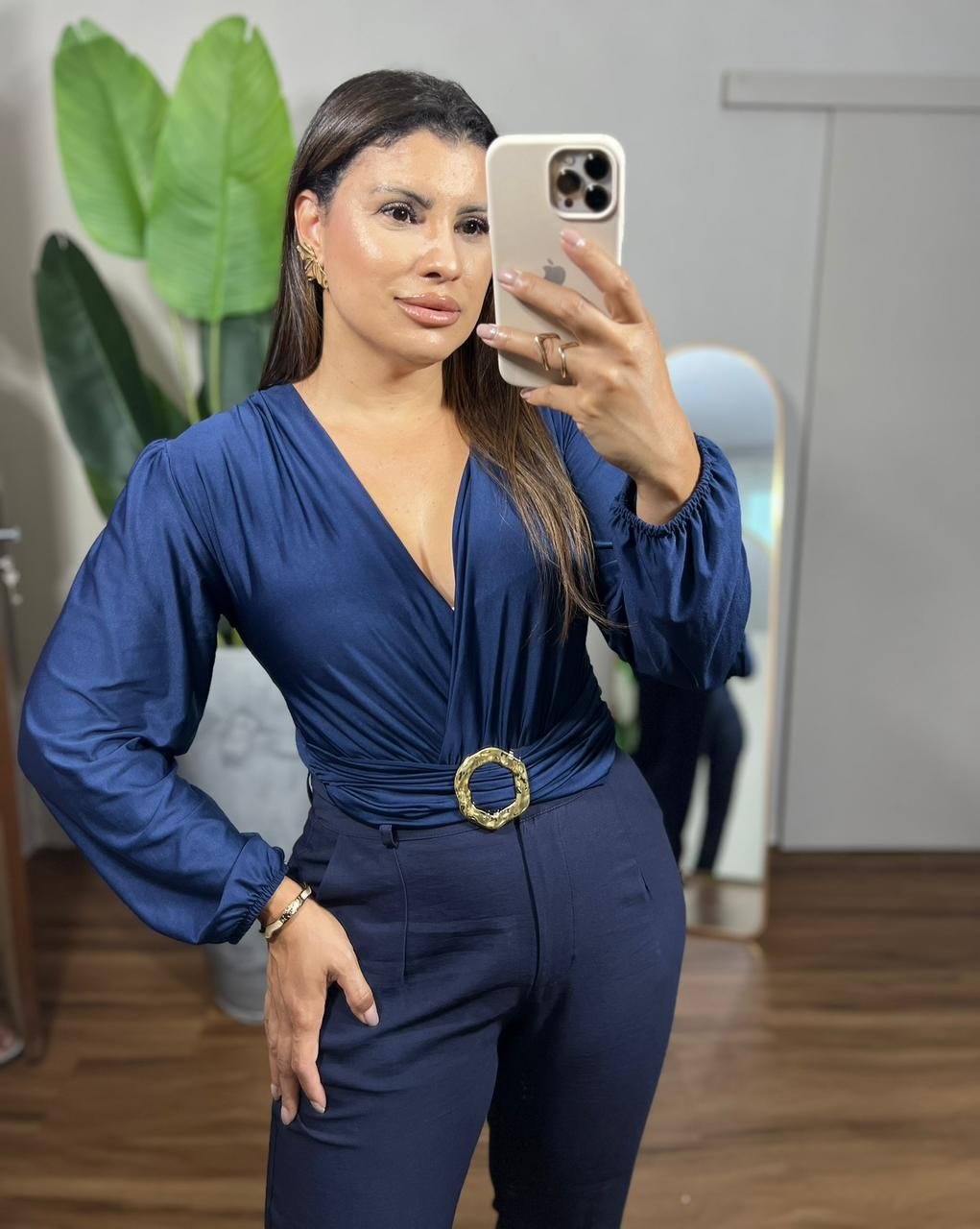O modelo possui decote transpassado em V que valoriza o colo, mangas longas com leve volume e acabamento ajustado nos punhos, trazendo um toque refinado.