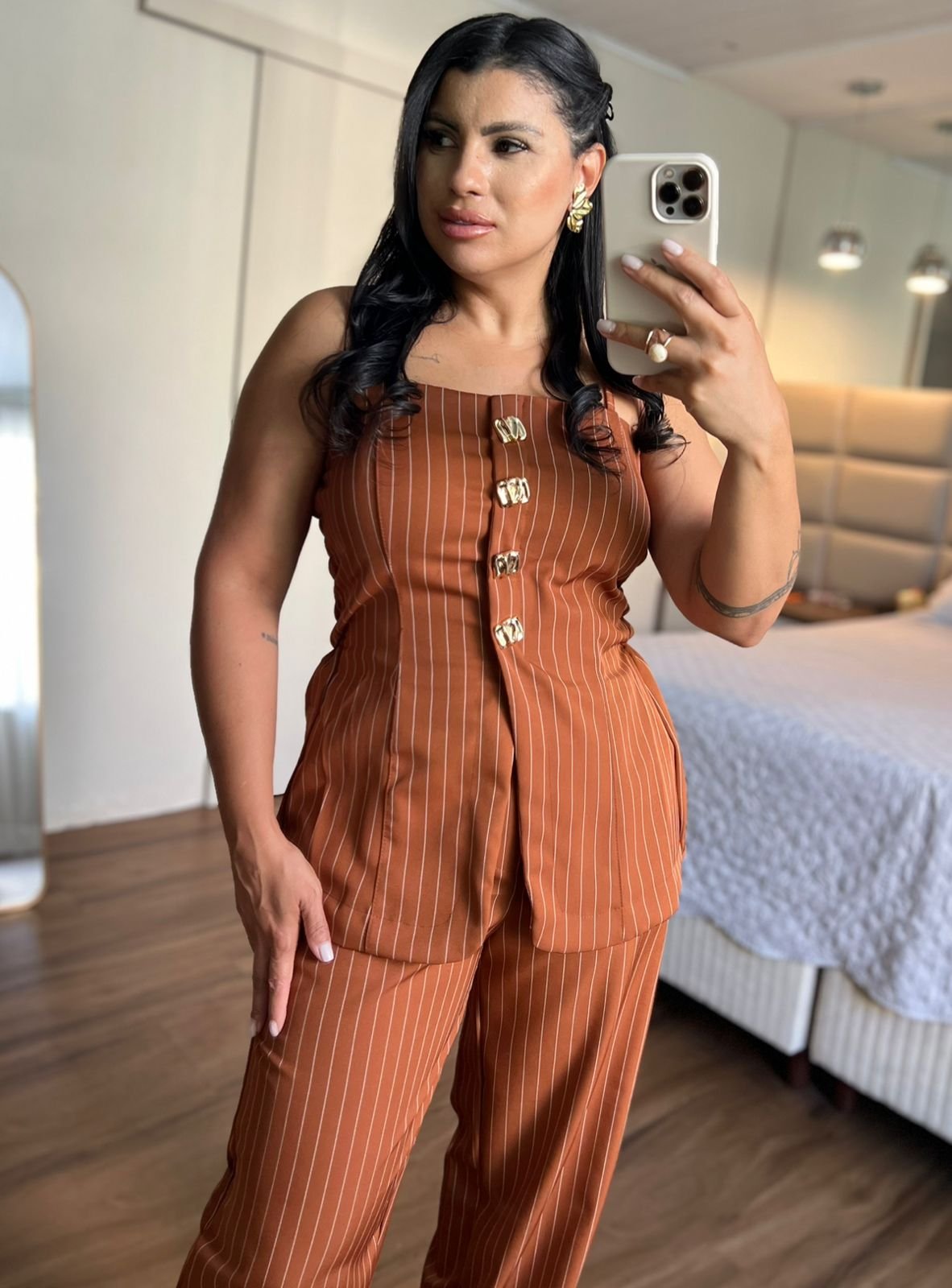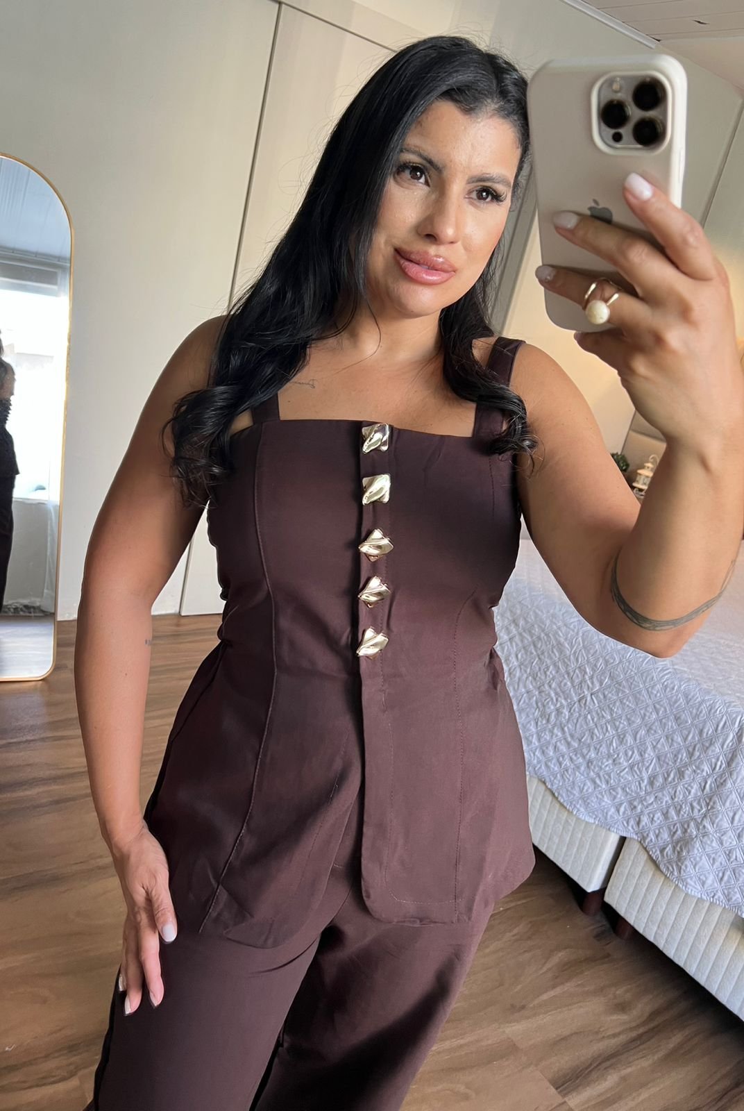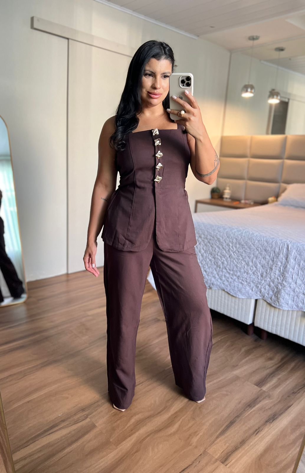 Conjunto marrom elegante com blusa de alças largas e botões frontais decorativos, combinado com calça de modelagem reta que alonga a silhueta. Sofisticado e versátil para diversas ocasiões. ✨