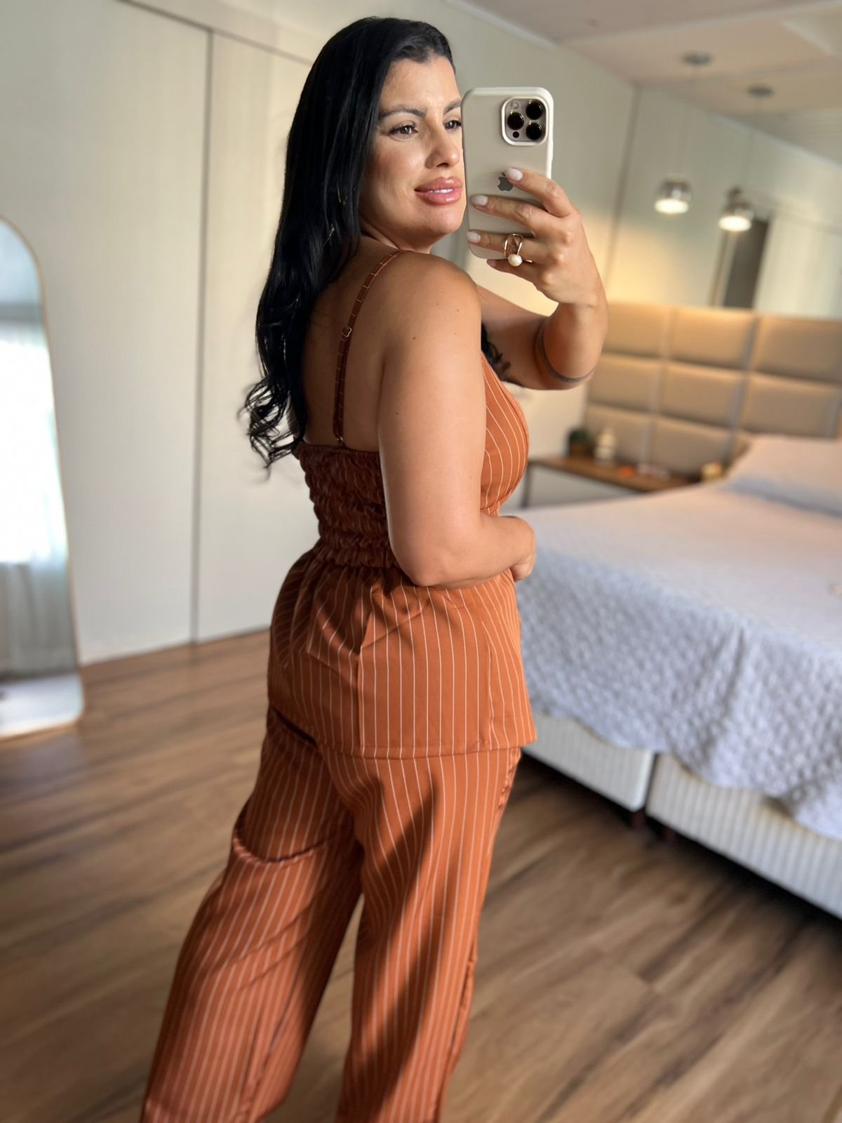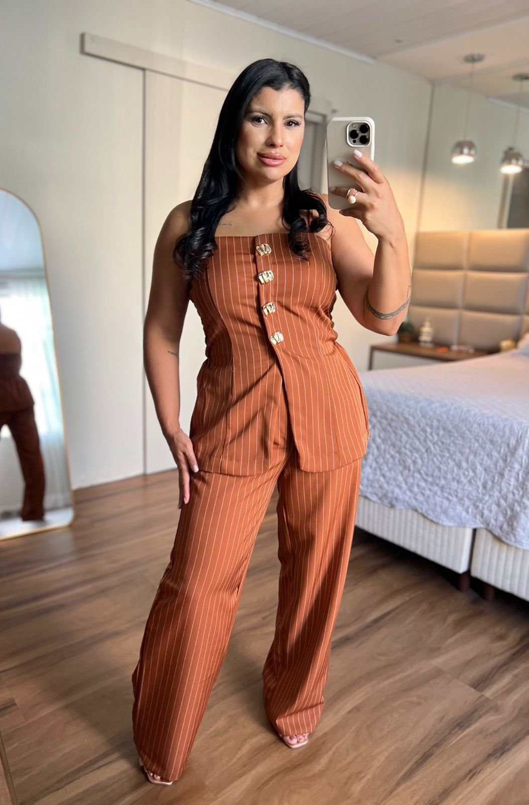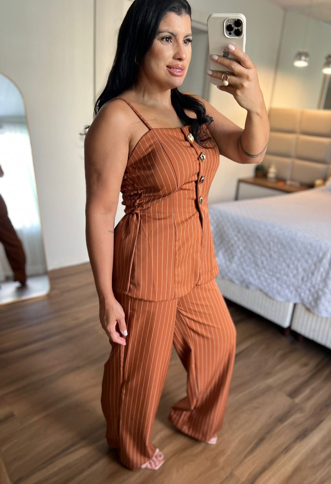 Conjunto marrom elegante com blusa de alças largas e botões frontais decorativos, combinado com calça de modelagem reta que alonga a silhueta. Sofisticado e versátil para diversas ocasiões. ✨