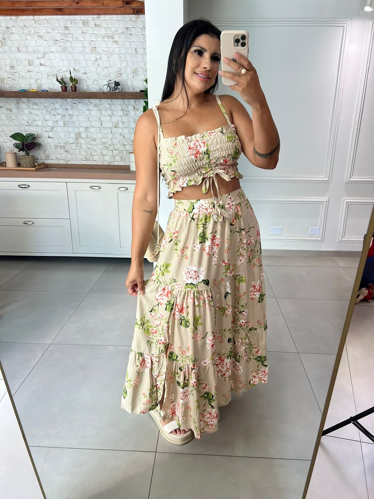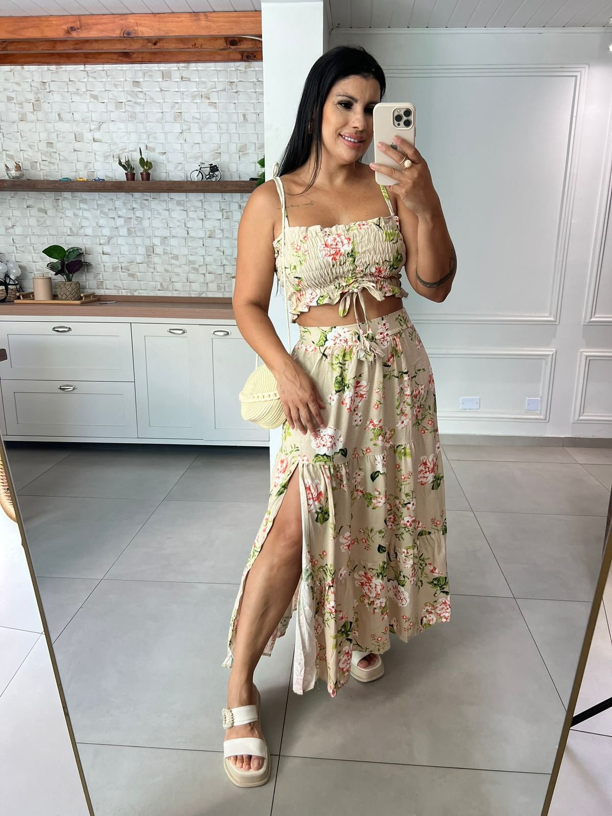 Delicado e cheio de charme, o Conjunto Floral é composto por saia e cropped com lastex, oferecendo ajuste perfeito ao corpo e muito conforto ao vestir.