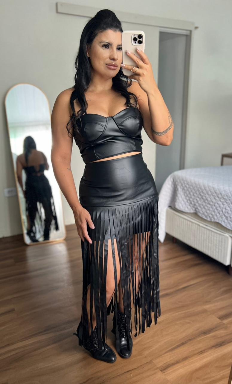 Conjunto em material sintético com top estruturado + saia midi com franjas que traz movimento e aquele toque fashionista que a gente ama. Marcante, moderno e simplesmente impossível passar despercebida!