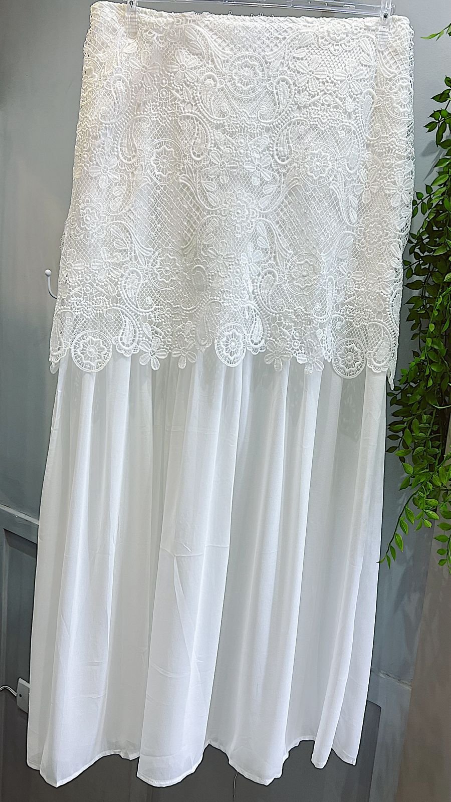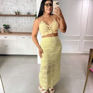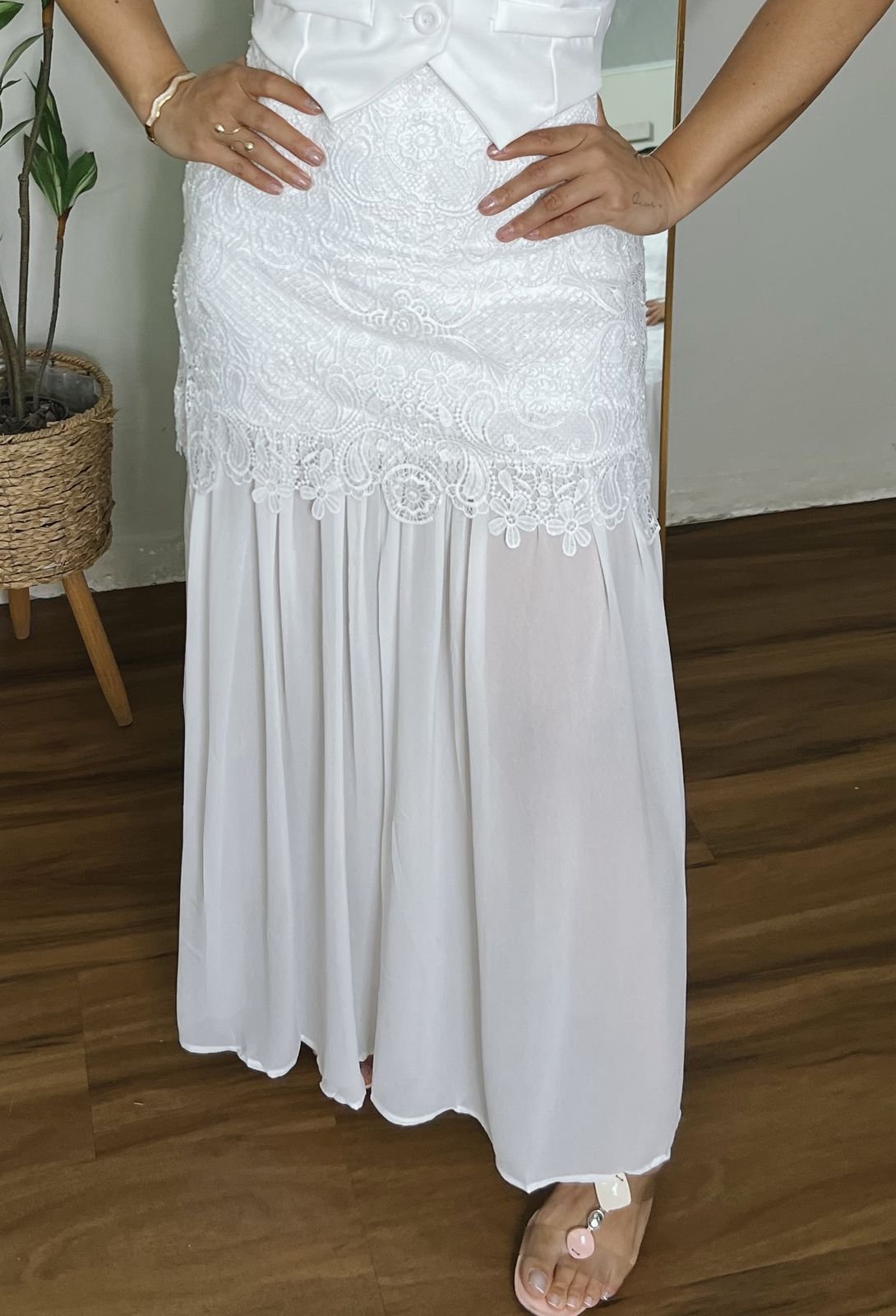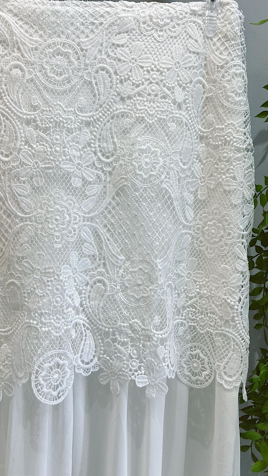 Sofisticada e feminina, essa saia midi combina a delicadeza do guipir trabalhado com a leveza do chiffon fluido. A parte superior em renda guipir traz um desenho rico em detalhes e acabamento refinado, enquanto a saia em tecido leve proporciona movimento e elegância ao look.