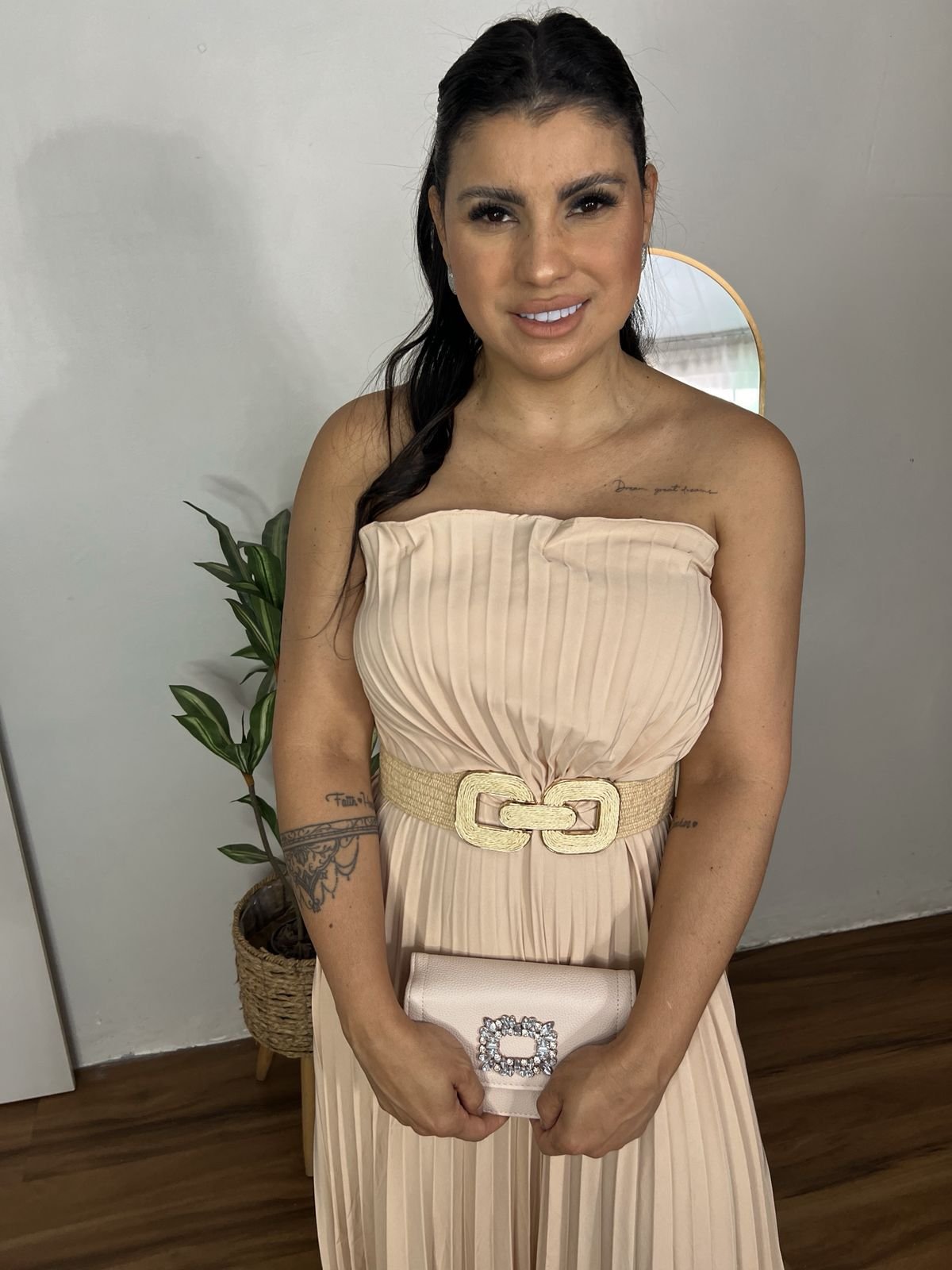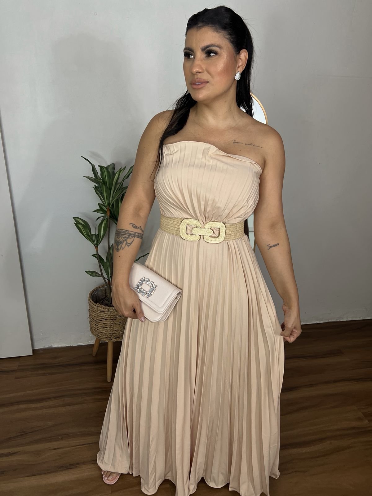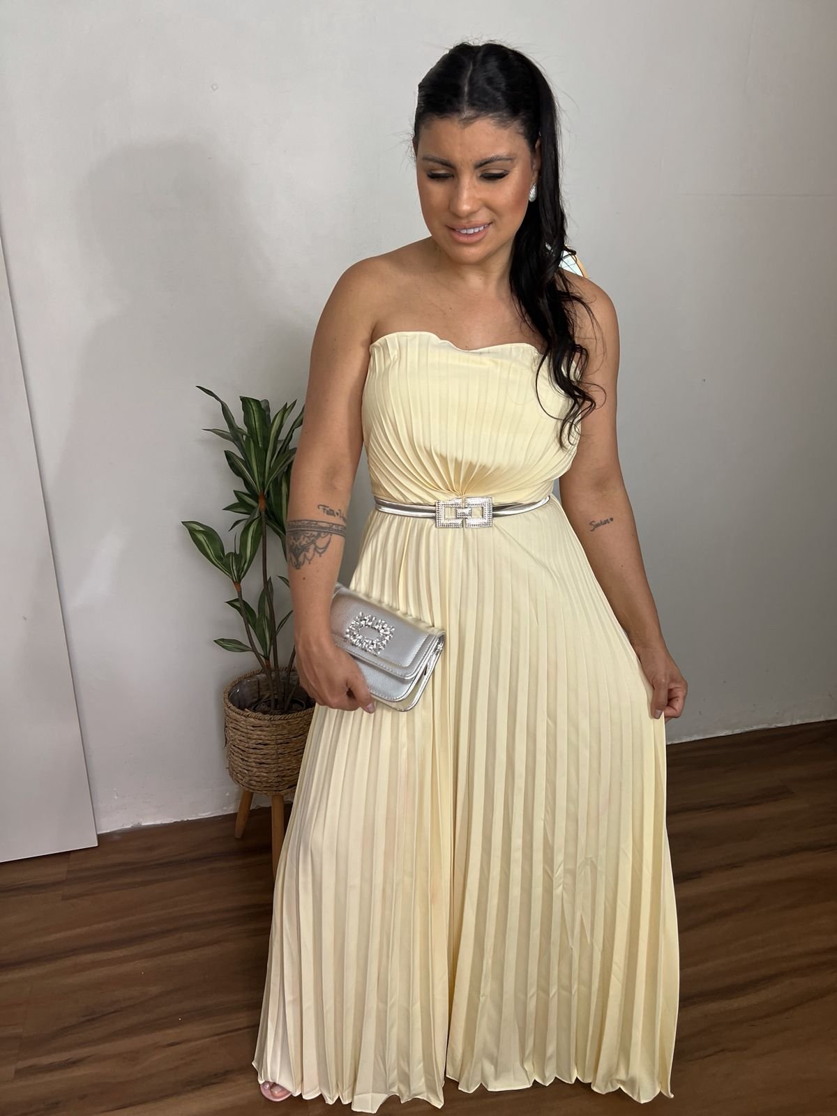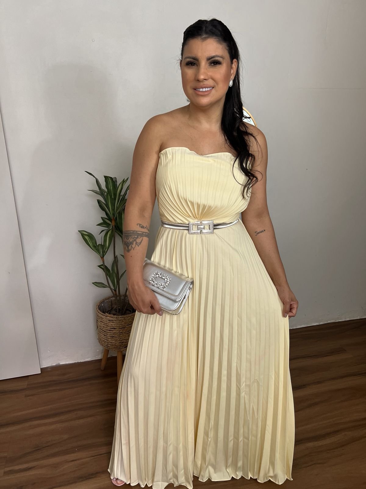 Elegância e delicadeza em um modelo que encanta nos mínimos detalhes. O vestido longo plissado em tom amarelo manteiga traz um visual sofisticado e romântico, perfeito para ocasiões especiais.