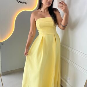 Com alças finas e decote estruturado que valoriza o busto, a peça conta com recorte frontal estratégico que traz modernidade ao design. A cintura marcada modela a silhueta, enquanto a saia fluida com fenda lateral garante movimento e elegância a cada passo.