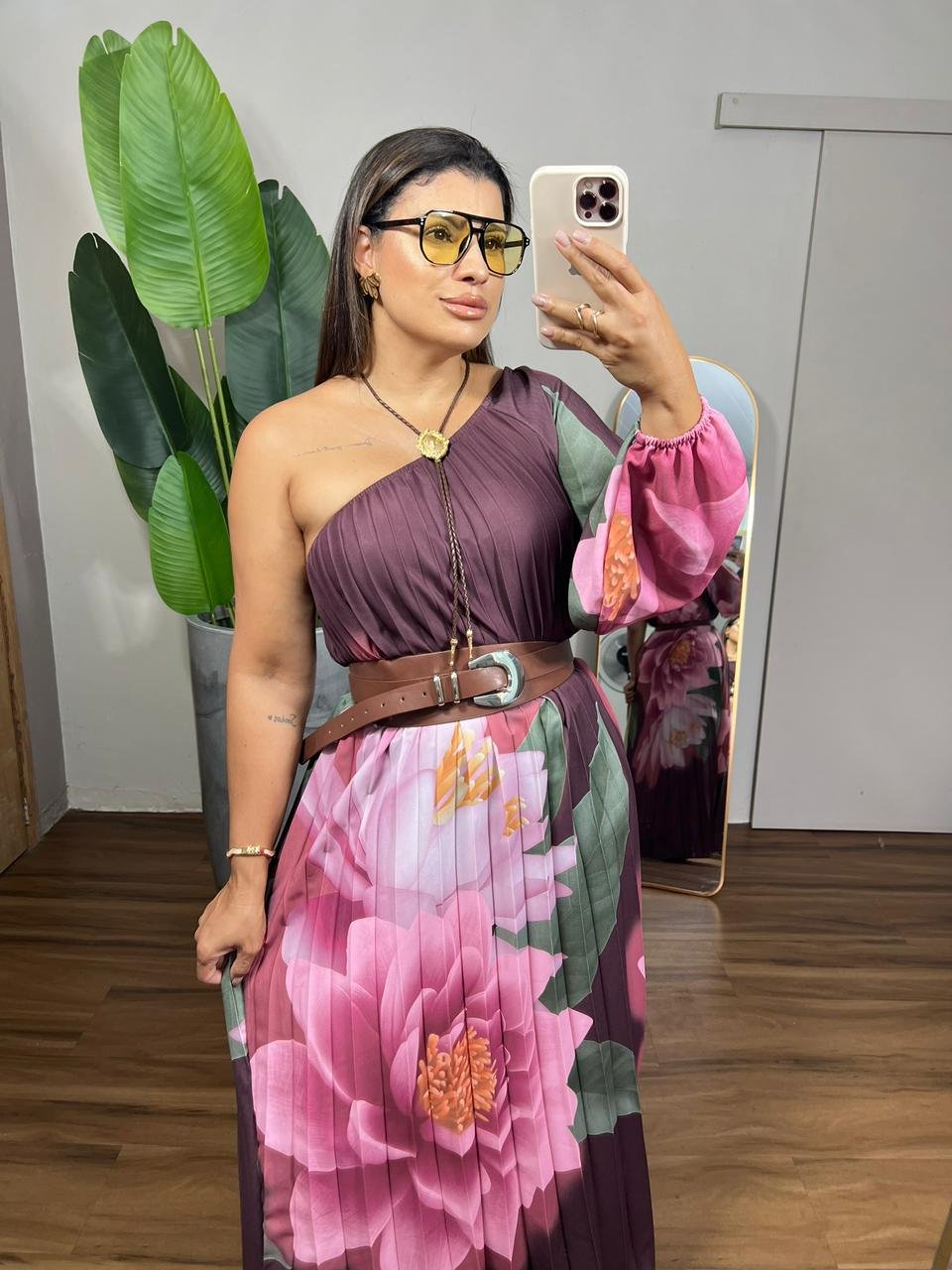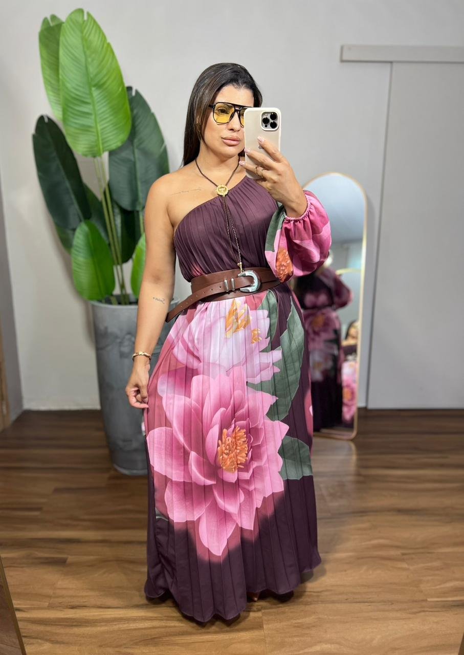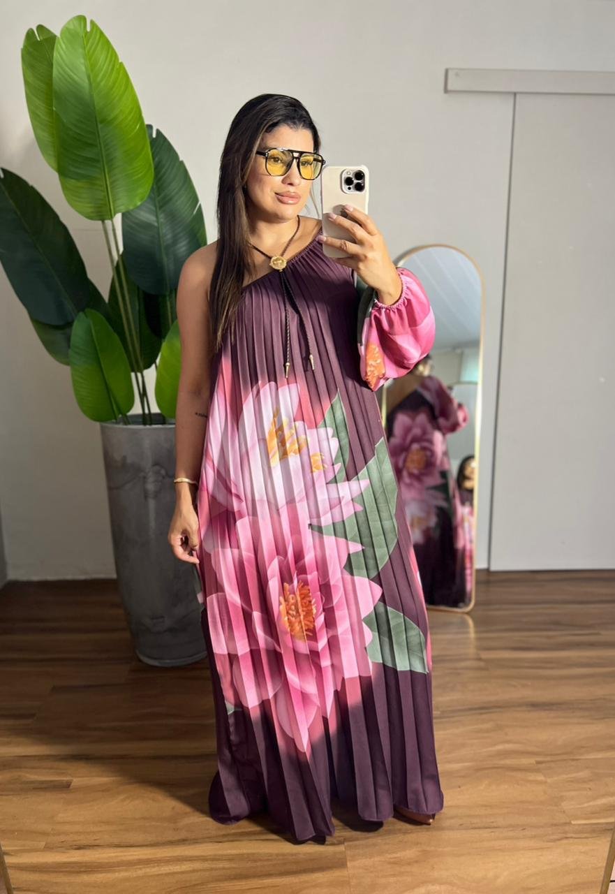 Vestido longo plissado com estampa floral marcante, perfeito para um look elegante e moderno. Possui modelagem fluida, caimento leve e detalhe no decote com aplicação sofisticada. Ideal para ocasiões especiais com muito estilo e conforto.