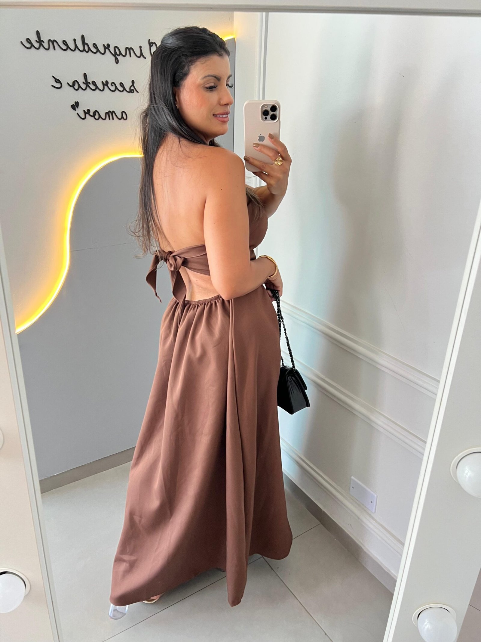 * Cintura Marcada: O detalhe em faixa no abdômen define a silhueta, abrindo em uma saia levemente rodada com pregas discretas.